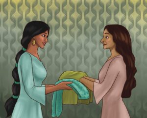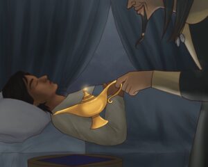Aladdin marveled at the young lady’s easy manner and generous spirit. He somehow knew that she could be trusted. Before long, he told her the rest of his story – how he discovered the magic lamp in the cave in the first place, how he used his wishes to impress the Sultan so he could marry the Princess, and how the lamp was later stolen from him.