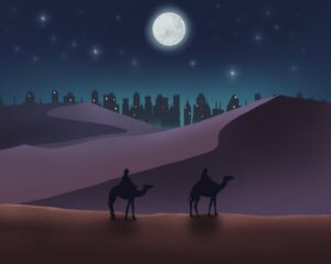 Yet a sadness was growing in Aladdin’s heart. Nadia was indeed a nice young woman, but there was something about that woman who rode the camel train, the one who sold perfumes and potions. He could not get out of his mind the sound of her laugh, her clever mind, and the comfort of her company.