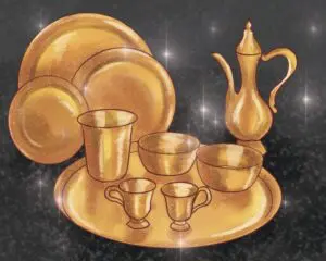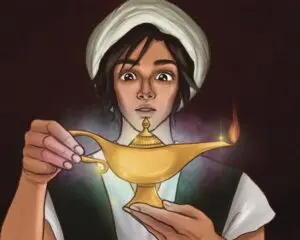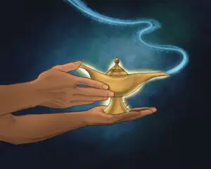 His mother could not believe what her son told her.  “You tell me that’s a magic lamp?” she laughed. “That old thing?” She took the lamp, grabbed a rag, and started to clean it.  “If there were really a Genie in this old lamp, I would say to it, ‘Genie, make a feast for my son and me, and serve it on plates of gold!’”