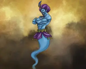 Rubbing the lamp, he moaned, “Oh, I wish I could get out of here!”  At once, a huge Genie rose up into the air.
