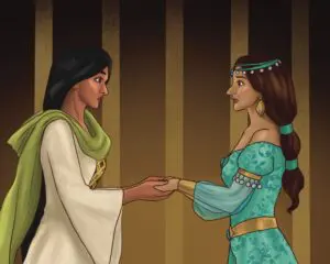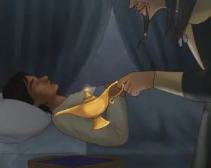 Aladdin marveled at the young lady’s easy manner and generous spirit.  He somehow knew that she could be trusted. Before long, he told her the rest of his story – how he discovered the magic lamp in the cave in the first place, how he used his wishes to impress the Sultan so he could marry the Princess, and how the lamp was later stolen from him.