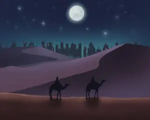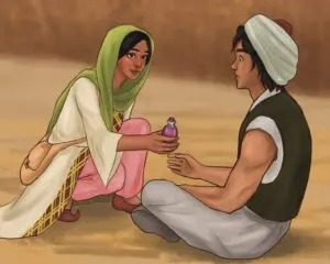 Yet a sadness was growing in Aladdin’s heart.  Nadia was indeed a nice young woman, but there was something about that woman who rode the camel train, the one who sold perfumes and potions.  He could not get out of his mind the sound of her laugh, her clever mind, and the comfort of her company.