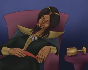 “At first, I loved it.  What’s not to love? I liked well enough the fine gowns and all the attention I got.  But I got carried away with this palace, and the Vizier is here, too.  For the last two days he has done nothing but fly about in a rage and smash things. He terrifies me!”