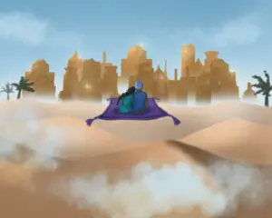 In a quiet place, the Vizier made his first wish: “Genie, do as I say.  I want you to take Aladdin’s palace to a faraway place in the desert that no one can find!”