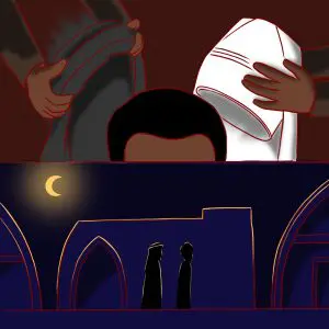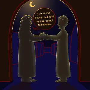 That same evening the king, accompanied by the grand vizier, went disguised through the town as it was his custom occasionally to do. On passing through a street, the king heard a noise. He came to a gateway through which he saw ten or twelve children playing by moonlight. The king heard one of the children say, “Let’s play courtroom.”