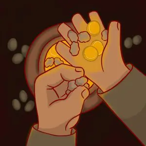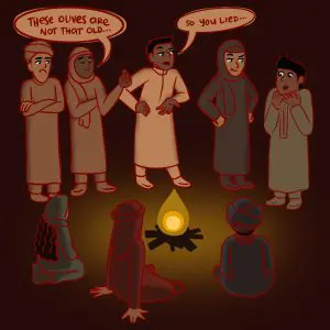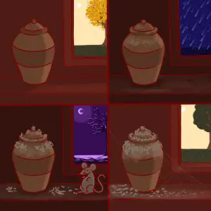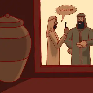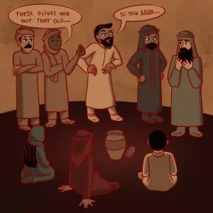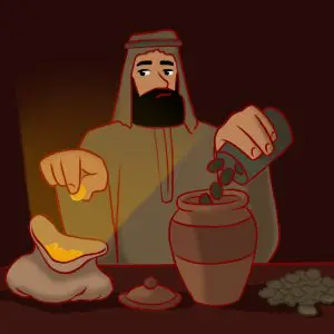 In the days ahead, the merchant could think of nothing else but how he might appropriate Ali’s gold for his own use, and yet escape detection in case his old friend should return and ask for the jar. The next morning the merchant went and bought some olives of that year, then secretly went and emptied the jar both of the old moldy olives and of the gold.