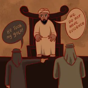 Then the merchant made the same defense he had before, saying that though it’s true that he had kept Ali’s jar in his warehouse, he had never once meddled with it. The merchant swore that as far as he knew, the jar contained only olives. Once again, he strongly objected that he should be brought to court on the basis of such unfounded accusations. He proposed to make an oath that he never had the money he was accused of taking, and to swear that he did not so much as know such a sum ever existed. The judge agreed to take his oath. After the merchant swore his ignorance of the entire matter, the judge dismissed the case for lack of evidence.