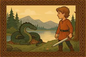 One day not long after that as the lad sailed back to his island, he saw what looked from a distance like a heap of seaweed. Curious however, the seaweed moved. As he sailed to shore, the lad saw that it was a wee brown-haired lass whose mangled dark hair lay in a heap around her.