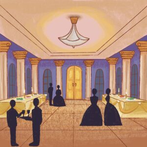 There was a great feast going on there, and the night was as bright as the day with all the lamps and candles that were lit inside. The musicians were at the two ends of the hall, and they were playing the sweetest music that ever an ear did hear. Youths and members of the court were dancing and turning, making fun and laughing.