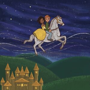 Then every one of the fairy men cried out, “Hie over cap!” As soon as they said those words, each fairy man’s horse rose up into the air and raced over the sea. So Guleesh called out those very same words. And before he knew it his horse, too, rode over the sea and sped over the blue water. When they landed on the other side onto dry land, one of the fairy men said to Guleesh, “Guleesh, do you know where you are now?”