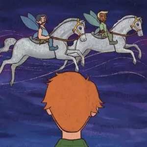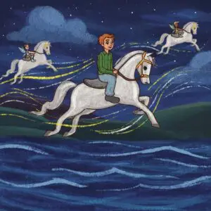Then every one of the fairy men cried out, “Hie over cap!” As soon as they said those words, each fairy man’s horse rose up into the air and raced over the sea. So Guleesh called out those very same words. And before he knew it his horse, too, rode over the sea and sped over the blue water. When they landed on the other side onto dry land, one of the fairy men said to Guleesh, “Guleesh, do you know where you are now?”