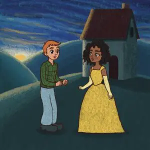 He began to wonder what he ought to do. He did not want to bring her home to his father’s house. Despite her fine clothes, he knew very well that they would not believe that he had flown to France on a magic horse and had brought back with him the daughter of the King. He feared they would tease the young lady, maybe even insult her.