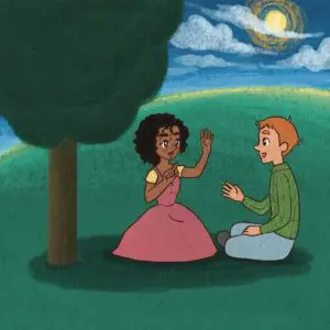 THERE WAS ONCE A BOY IN IRELAND, and Guleesh was his name. A little way off from Guleesh’s house stood a very old round fort, an ancient fort it was called a “rath.” At midnight one night, Guleesh was leaning against the rath and looking up at the beautiful white moon. He thought with longing, “Nothing happens here! If only I were in any other place in the world but here!”