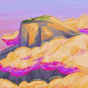 While they slept – no one knows how or why – but the rock inched upward, bit by bit. Their sleep was so deep the children didn’t stir at all. All that night the rock rose upward more and more. When the villagers awoke, they noticed a rocky hill taller than the highest tree that had somehow mysteriously appeared overnight.