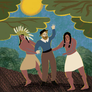 They did not understand her words. But soon they were showing her how to play tag and stickball. And she was showing them how to do cartwheels. After a while, Powhatan called, “Pocahontas! It’s time to go.” Every four or five days after that, Pocahontas came back with the others to the fort. Each time, Powhatan’s scouts carried corn, squash, and beans. Sometimes for a special treat – maple sugar, too. Pocahontas learned the names of her new friends – James, Nathaniel, Richard and Samuel. And they learned her name. She also learned the name of their leader, John Smith.