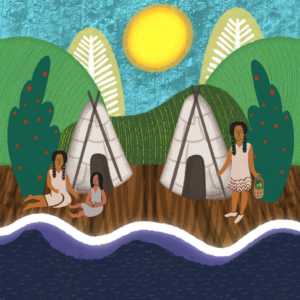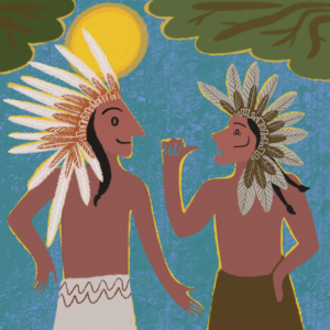 When they got there, they set down the baskets and stepped back. In a minute, the men of Jamestown in their odd clothes and speaking their odd language came out of the fort to greet the visitors with smiles. The gift was accepted. Pocahontas saw something else that made her smile, too. Boys a bit older than she also came out with the men of Jamestown. She waved to the boys, and they waved back. When the adults were trying to talk to each other using their arms and hands, she said to them, “Want to play?”