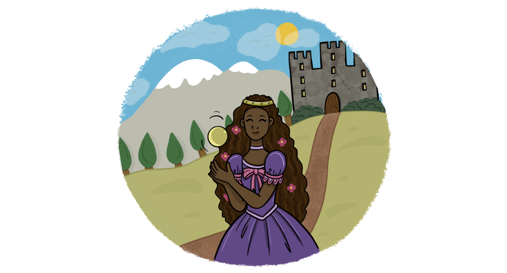 One afternoon after one of these suitors left, the Princess exclaimed, “This is too much to bear! Sometimes I wish I were little again, before I had to deal with all these suitors.” She remembered with special fondness a favorite ball, one that sparkled in the sun when she threw it high into the air.
