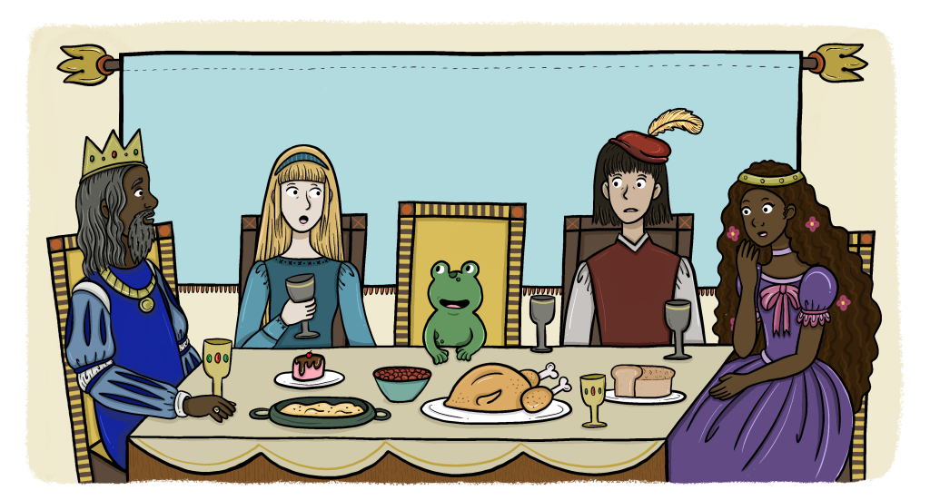 That night when the Princess sat at dinner with her family and royal advisers, there was a knock on the door. A servant opened the door but saw no one there. The Frog, standing down low, cleared his throat.