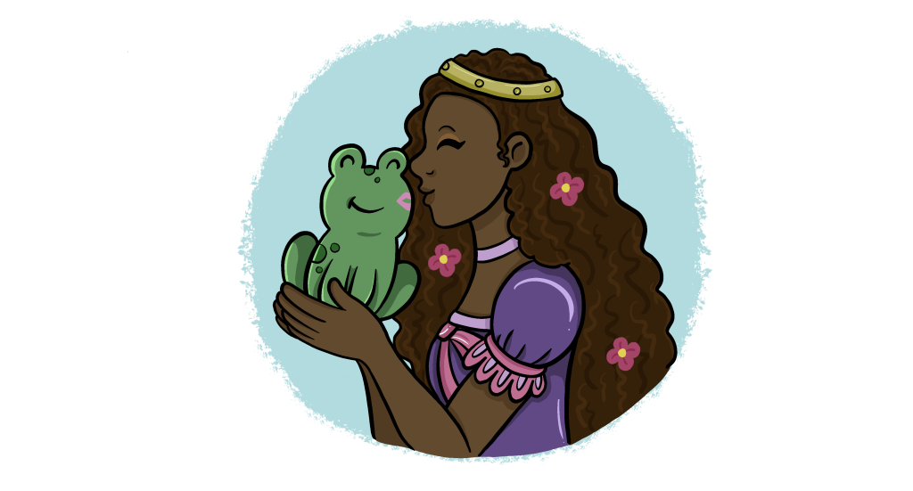 The Princess jumped back in surprise, and who could blame her? The Prince, who had been a frog just a moment ago, quickly told the princess not to worry. Years before, he said, an evil witch had put a spell on him that he must stay a frog until he was kissed by a princess. The witch had laughed an evil laugh, saying, “Like will ever happen!” But now it did!