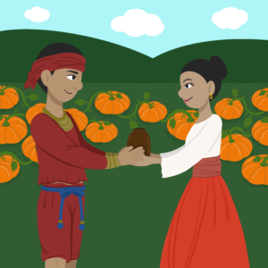 For this was her answer to the riddle: She had placed a pumpkin bud, one that was still attached to a vine in the ground, inside the jar through its small opening. Over time the pumpkin bud grew into a full-sized pumpkin. When the pumpkin filled the jar, she simply cut off the stem and delivered the jar with the pumpkin to the palace.