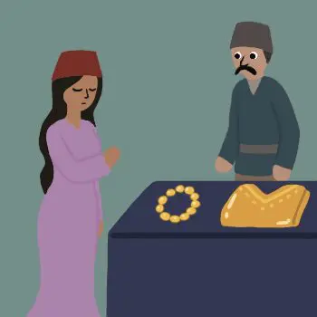 The merchant bowed to the Queen and handed her a gold tray, on which was neatly folded a piece of gold cloth. She glanced at it, without examining the design, and said, “What is the price of your cloth?”