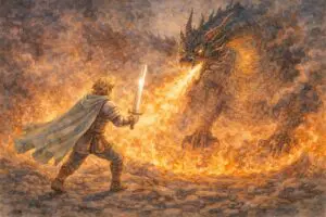 “How lucky for me that we meet this way, with your last arrow released from your hand,” boomed the voice of a strong and mighty knight. “King Arthur, for many a year you have done me wrong! Now it is time for me to quiet you.”