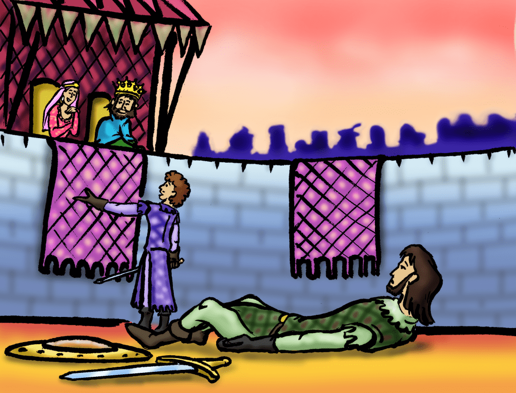 When the feast was over, she asked her uncle, the King of the land, if he would allow Geirald, the hero known to have defeated the robbers and slain the giant, to fight a tournament the next day with one of her pages. The King gladly gave his permission.