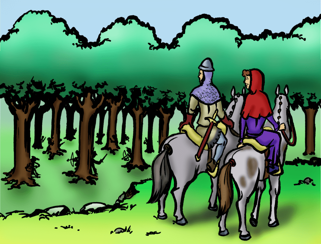 They had not gone far when, riding across a mountain, they caught a glimpse of several armed men hiding amongst some trees in their path. Suddenly they remembered some talk they had heard before of a band of twelve robbers who lay in wait for rich travelers.