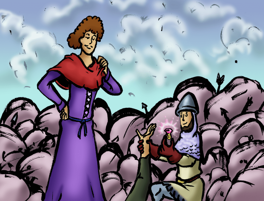 Dazed, the Hankur band was not difficult for Stefan and Geirald to defeat. Stefan wrestled in hand-to-hand combat with chief Hankur the Tall himself, finally defeating him, too. Then Stefan took from Hankur the Tall a beautiful ring set with a large stone, and put it on his own finger.