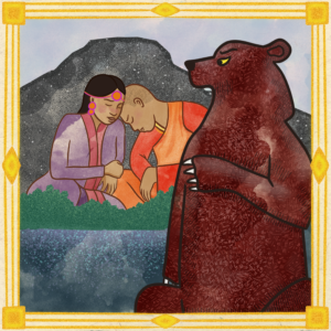 The other two demon-bears, also touched by the beauty and nobleness of their captives, readily agreed with the chief. They resolved to begin at once to be the friends and not the fearful enemies of humans. As they entered the cave, they saw that Sunlight and the Princess grew white with terror at the sight of them, so the chief called out, “Be not afraid! The heart of a demon-bear is not always as cruel as men say! We have come not to devour you, but to set you free. A lad and lass who, in such a dire strait, think only of each other, deserve to live long in peace. By my magic power, I declare your bonds broken!