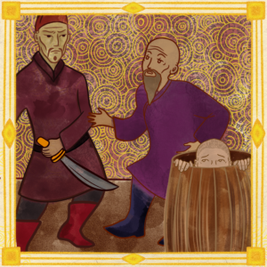The old man noticed the Khan’s soldiers coming across the desert and at once guessed why they were there. While the men were still far off, he ran quickly to the two young men and urged them to hide. Sunlight climbed into a barrel of mangos, crouching down until they covered him, and Moonlight hid in a sack of grain. When the soldiers pounded on the red door, the hermit allowed the soldiers to enter.