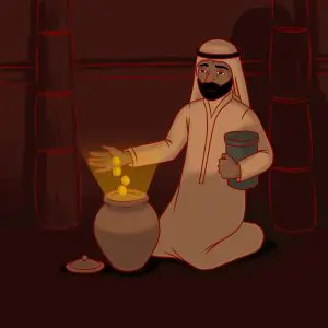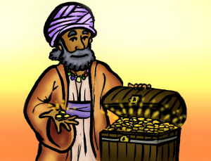 The old man noticed the Khan’s soldiers coming across the desert and at once guessed why they were there. While the men were still far off, he ran quickly to the two young men and urged them to hide. Sunlight climbed into a barrel of mangos, crouching down until they covered him, and Moonlight hid in a sack of grain. When the soldiers pounded on the red door, the hermit allowed the soldiers to enter.