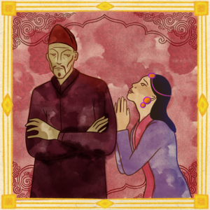 “Nay,” said the Khan’s elder daughter. “Do not mourn for me. It is my father’s will that I must die and I accept that is where my fate will end. You are the one who is meeting the more cruel fate – to be captured and killed, and for what? – because you are a stranger? I cannot live in such a world – indeed, it seems more than my sad heart can bear!”