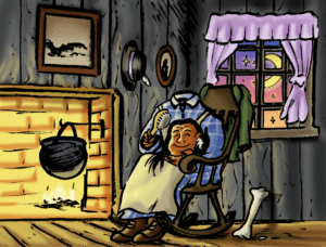 “Make a fire, child, to cook the supper,” said the old woman, and she sat down near the fireplace. Then she reached up to her head and twisted it off, placing it on her knees like a small round watermelon.