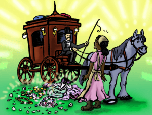 Once Blanche was on the road, she threw one of the eggs behind her. In the corner of her eye, she caught a glance of something shining. She turned around and — imagine her surprise! — there, amid the broken egg shells, glittered a pile of diamonds! From another broken egg sprang gold jewelry, from another one a beautiful carriage. Yet from another, beautiful dresses beyond belief.