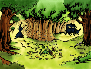 She took Blanche’s hand and they began to walk into the deep wood. Strangely, thorn bushes opened up by themselves before them and closed behind their backs. A little further on, Blanche saw two axes fighting each another all by themselves. She found such goings-on very odd, but she did not laugh or say anything. They walked further and behold! it was two arms which were fighting; a little further, two legs; at last, she saw two heads fighting by banging their foreheads against each other. All this was strange beyond belief, but Blanche did not laugh or say a word.