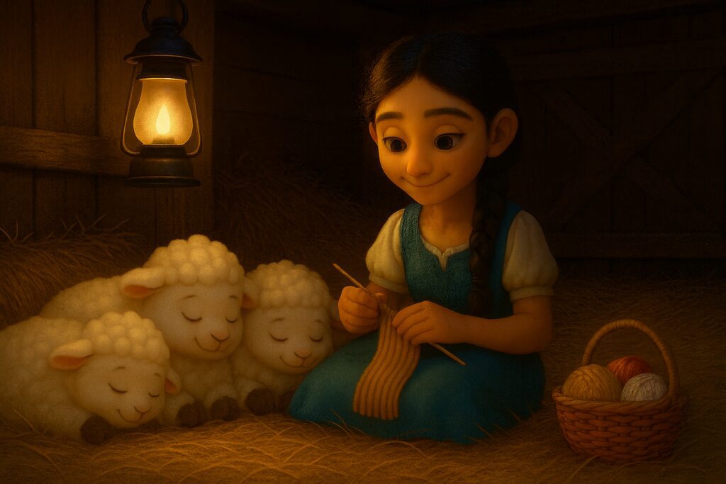 The three sheep snuggled together with soft bleats and soon fell asleep. Sofia pulled out her knitting bag. Though the barn’s light was dim, her fingers knew what to do. She quietly finished three wool scarves she had been working on – one for each sheep.